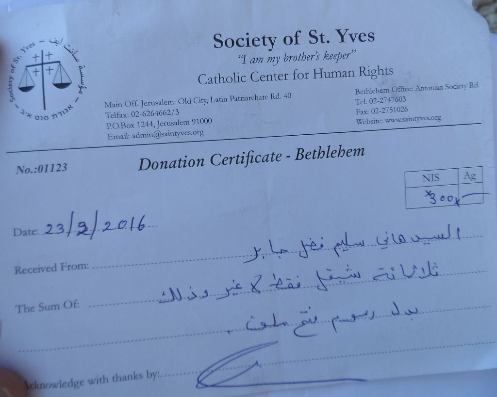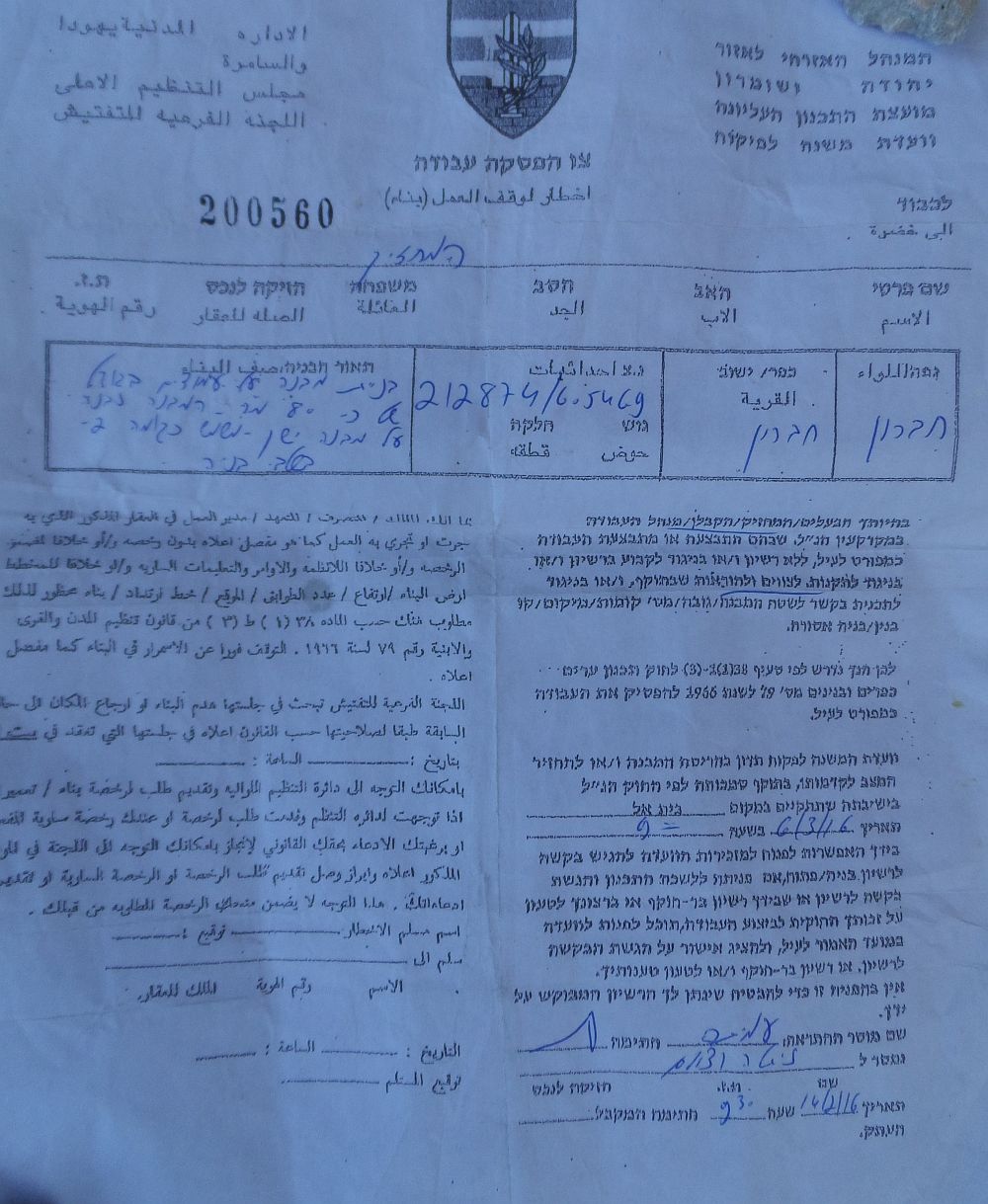 وبعد تلقي المواطن جابر إخطار وقف العمل قام بإعداد الملف اللازم للتقدم بطلب الترخيص، كما توجه إلى مؤسسة " سانت ايف " لتوكيلها بالاعتراض على إخطار الاحتلال.