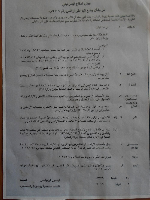 Israeli Occupation Forces issued the military order number (16/5/md) to seize 5.942 dunums from the lands of Al-Bireh city. Noteworthy, the targeted lands are private Palestinian ones owned by farmers from Beitin village.