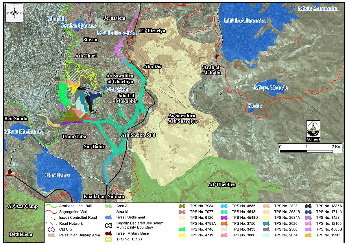 [2] Sur Baher, Um Tuba, Sharafat, Beit Safafa, As Sawahra Al Gharbiya, Jabal Al MukkabiR, Ath Thuri, Silwan, Jerusalem, Al Isawiya, Shu’fat, Beit Hanina, Part of Qalandyia, Part of Hizma, Part of Kafr Aqab.