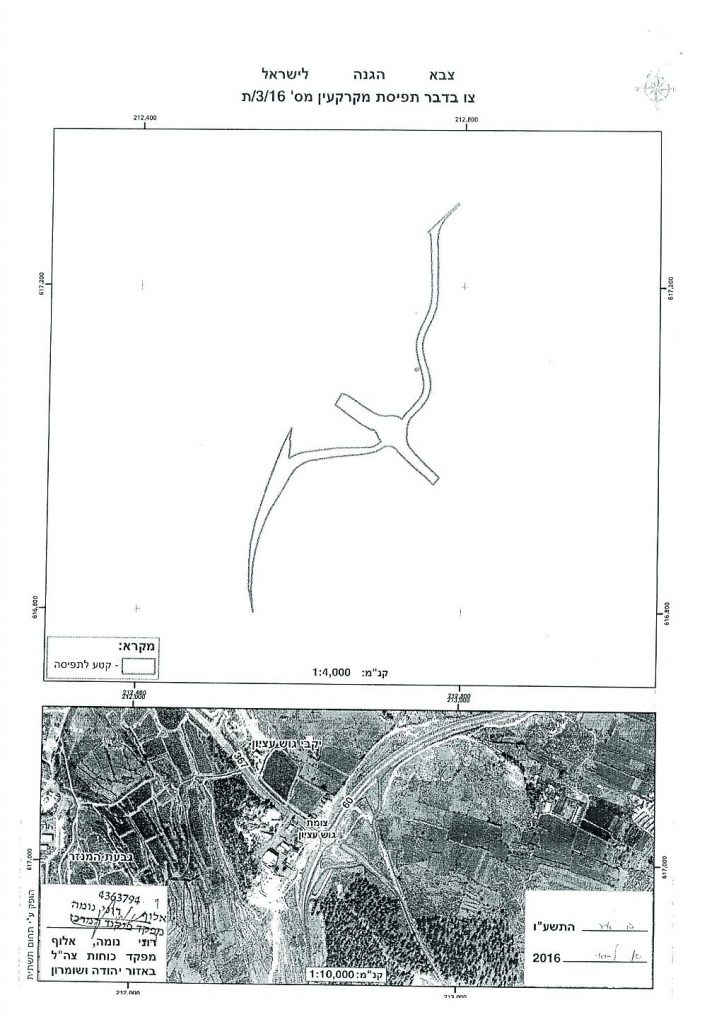On May 10, 2016, Israeli Occupation Forces issued the military order T/3/16 to seize an area of 8.85 dunums from the lands of Beit Ummar for security purposes. The order mentioned that the seizure came for the purpose of opening a new lane Gosh in Etzion junction for cars coming from Hebron area and heading north.
