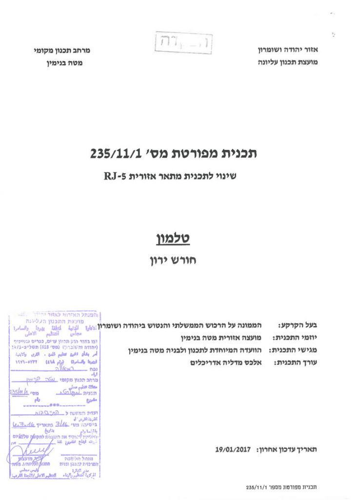 The so-called Higher Planning Committee- Israel Civil Administration deposited a new master plan no. 235/11/1 for Talmon colony. The advertisement was featured in Al-Quds newspaper the on January 27, 2017.