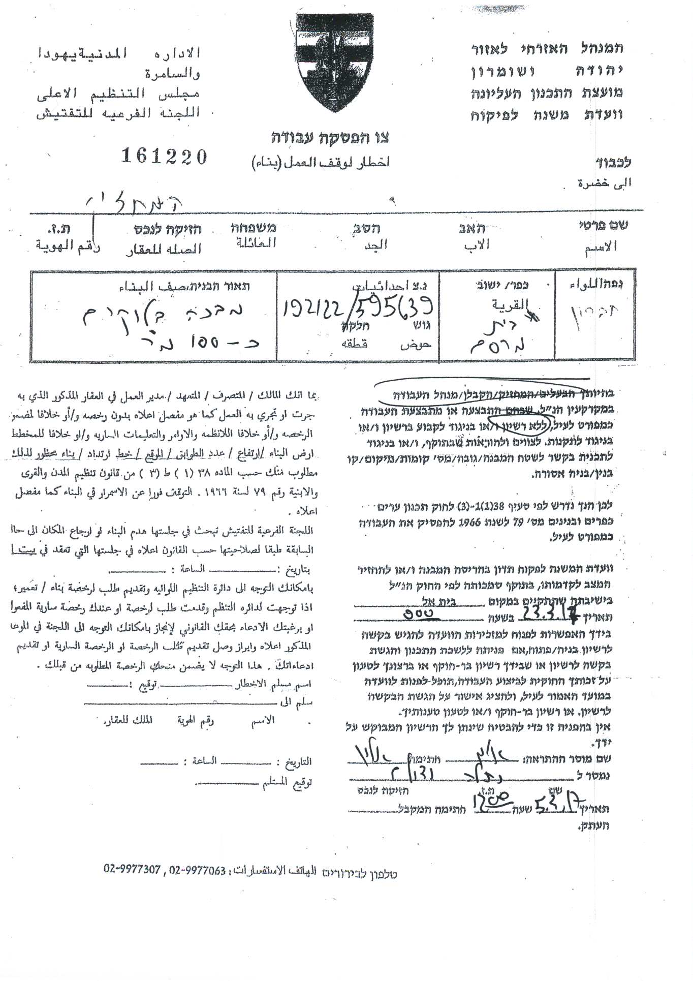 وجاء في إخطار الاحتلال الذي يحمل الرقم (161220) بعنوان " إخطار لوقف العمل –بناء" بان المبنى قد شيد دون ترخيص في المنطقة المصنفة " ج" حسب اتفاق أوسلو، وطلب من المواطن التوقف عن أعمال البناء، وحدد تاريخ ( 23/3/2017) موعداً لانعقاد جلسة لما يسمى باللجنة الفرعية للتفتيش التابعة لما يسمى بمجلس التنظيم الأعلى، حيث ستناقش في جلستها التي ستعقد عند الساعة التاسعة صباحا من التاريخ المذكور " هدم البناء أو إرجاع المكان إلى حالته السابقة. وبالنظر إلى المنزل المهدد فهو في مرحلة الإنشاء، حيث تم سقفه حديثاً، وتبلغ مساحته (200م2) ويضم بداخله بئر مياه مستخدم يتسع ( 100م3)، ومن المقرر أن تقطنه أسرة المواطن عمرو المكونة من ( 10) أفراد، من بينهم ( 4) أطفال.