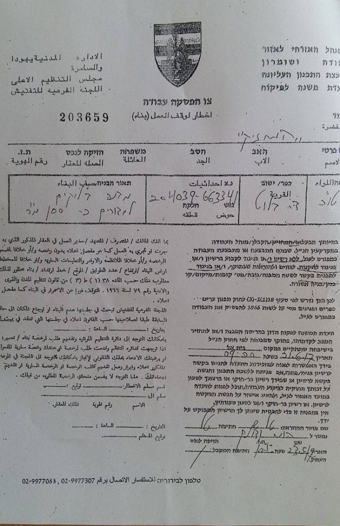 According to the military order number 203659, the affected was given a deadline until July 03, 2017 to complete all licensing procedures. This comes in time with the hearing session of the Planning and Construction Committee in the Israeli court of Beit El to consider the legal status of the notified structures.