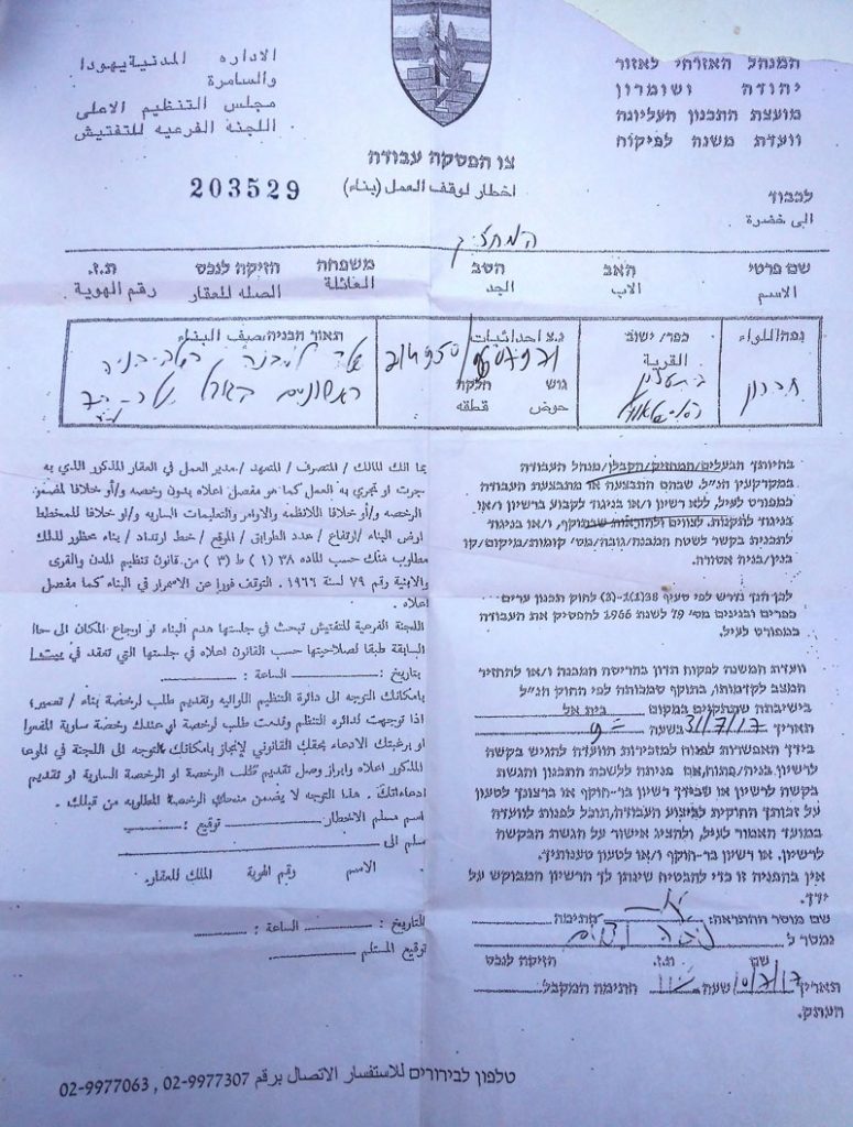The orders mentioned that the structures were "unlicensed" and ordered an immediate halt on all construction works. July 31, 2017 was assigned as the hearing session of the Planning and Construction Committee- Israel Civil Administration in the Israeli court of Beit El to discuss the legal status of the notified structures.