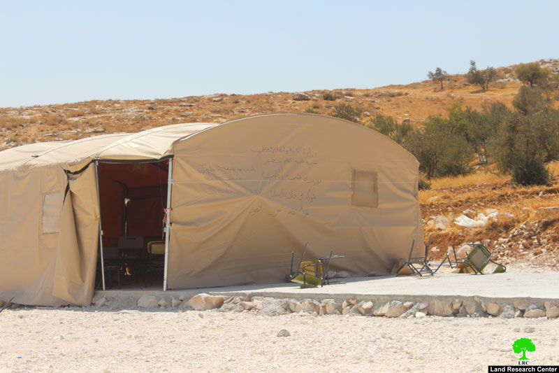 كما انه منذ بدء العمل بالأرض من حيث تجريفها وتسهيل الأرض لوضع الكرفانات ( الغرف الصفية)، أقدم الاحتلال على إخطارها بوقف العمل والبناء، وتم العمل على المتابعة القانونية مباشرة، إلا أن الاحتلال يأبى بأن يعيق العملية التعليمية، من خلال إعاقة استخدام الأرض لتحقيق أطماعهم المستقبلية بالسيطرة عليها  لتوسيع مستعمراتهم المقامة على أراضي القرية.