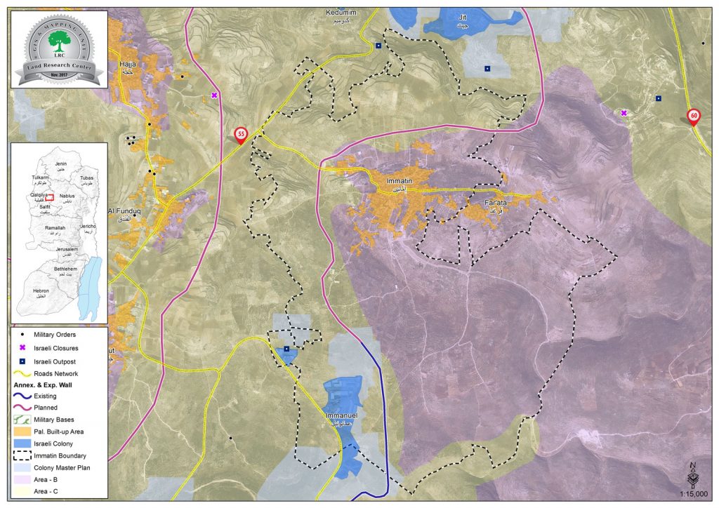مع بداية اشراقة صباح يوم الأربعاء وأثناء توجه المزارع الحاج فوزي احمد غانم من قرية أماتين إلى أرضه الزراعية والواقعة غرب القرية على مسافة لا تتعدى 200متراً من مستعمرة "عمانوئيل"، فتفاجأ هناك بقيام جيش الاحتلال بوضع إخطار خطي على جانب احد الجدران الاستنادية هناك، ويتضمن ذلك الإخطار العسكري أمراً نهائياً بإيقاف أعمال وهدم وإعادتها إلى سابق عهدها خلال فترة لا تتجاوز السبعة أيام، بدعوى عدم الترخيص، حيث وبحسب الإخطار الذي يحمل الرقم (565141 ) والصادر في 26/09/2017 فقد ادعى الاحتلال انه سبق وان اخطر بوقف البناء للجدران الاستنادية المحيطة بالأرض والأحواض الترابية فيها من خلال إخطار يحمل الرقم (203833) بتاريخ 19/07/2017م، هذا وتبلغ مساحة الأرض 4 دونمات.