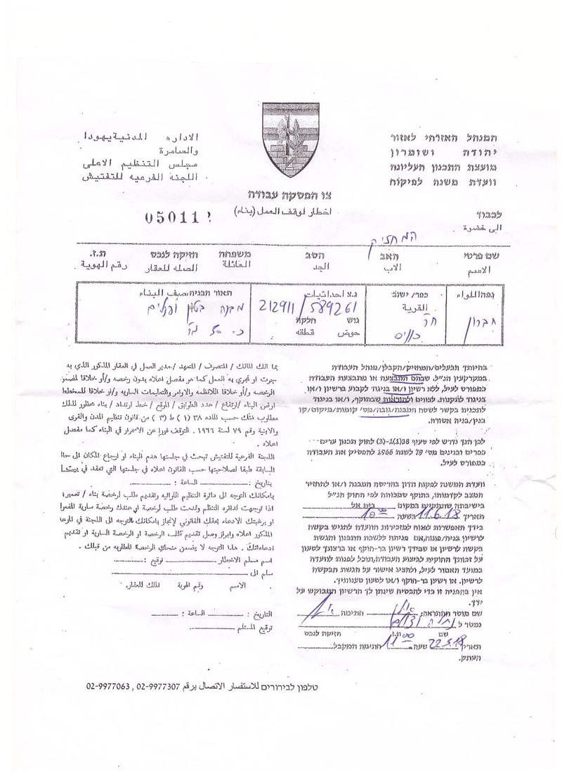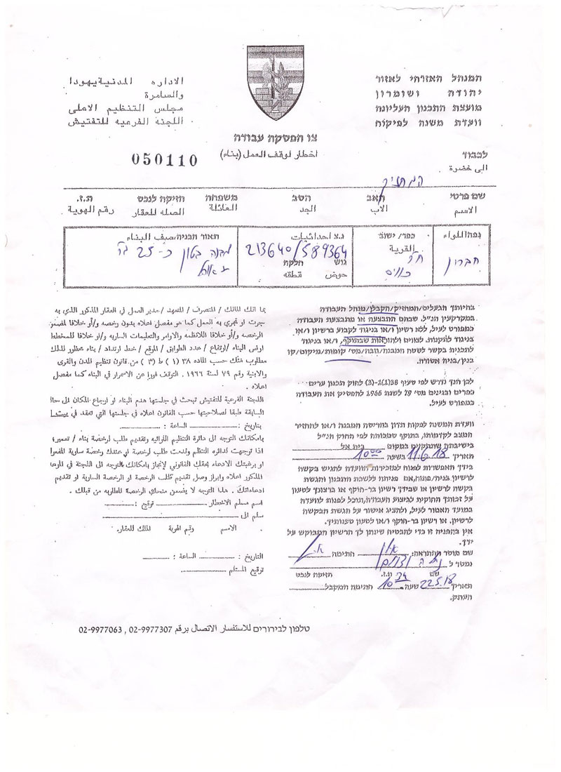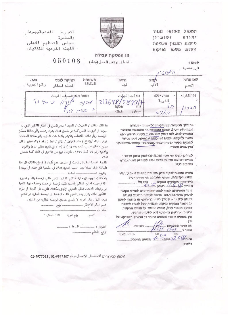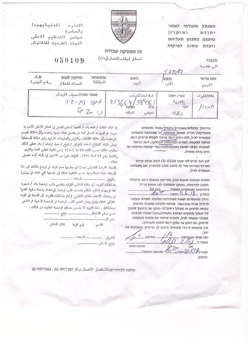 وطالبت إخطارات الاحتلال بالتوقف فورا عن أعمال البناء، وحددت تاريخ ( 11/6/2018) موعدا لانعقاد جلسة استماع لما يسمى باللجنة الفرعية للتفتيش، التابعة لدائرة التنظيم، حيث ستعقد جلستها بمقرها في معسكر ” بيت ايل” وستبحث فيها ما أسمته ” هدم البناء أو إرجاع المكان إلى حالته السابقة”.
