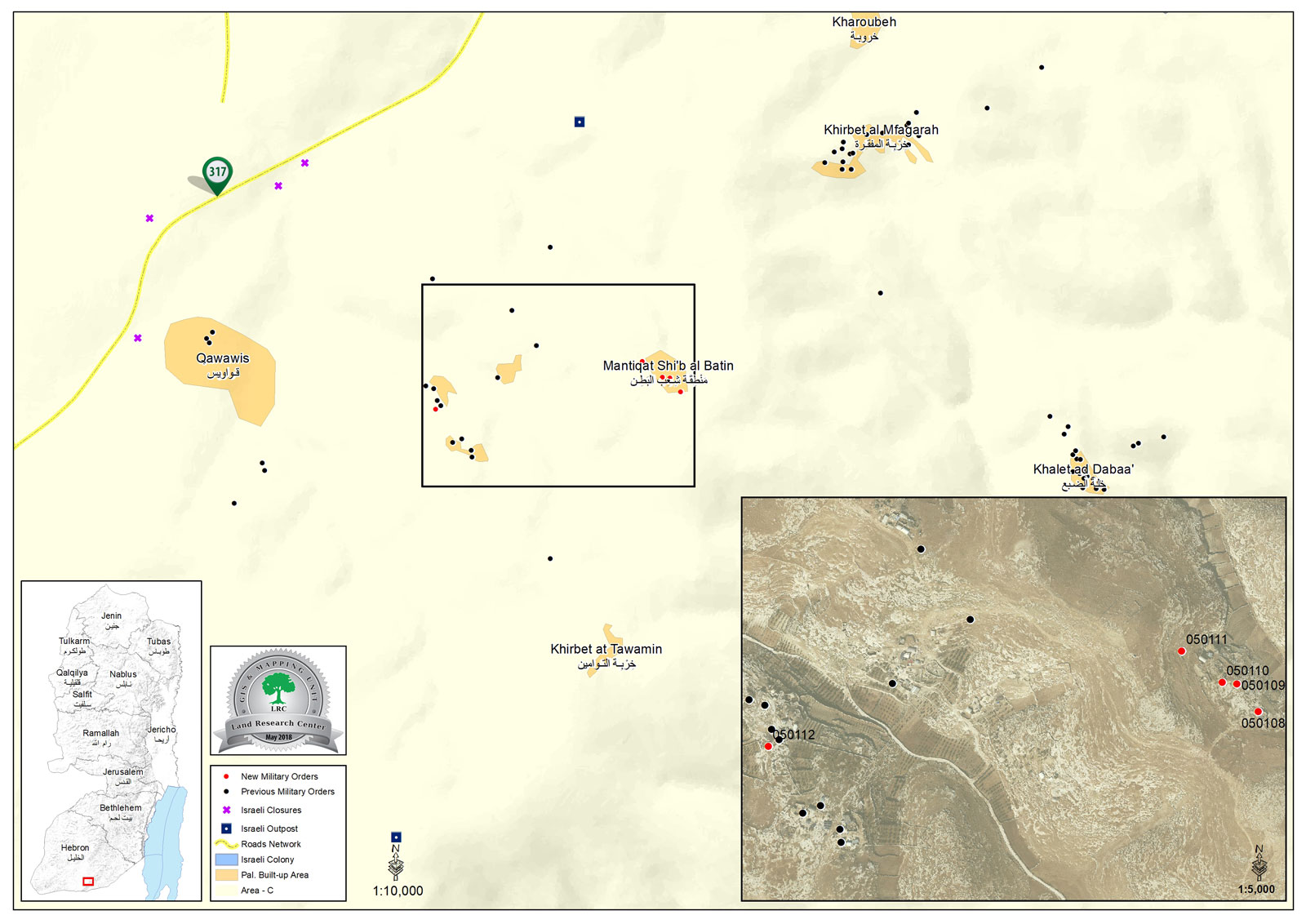 أخطرت سلطات الاحتلال الإسرائيلي، بتاريخ 22/5/2018، بوقف العمل والبناء بحجة عدم الترخيص في منشآت سكنية وزراعية وعيادة صحية بقرية شعب البطم شرق بلدة يطا بمحافظة الخليل.
