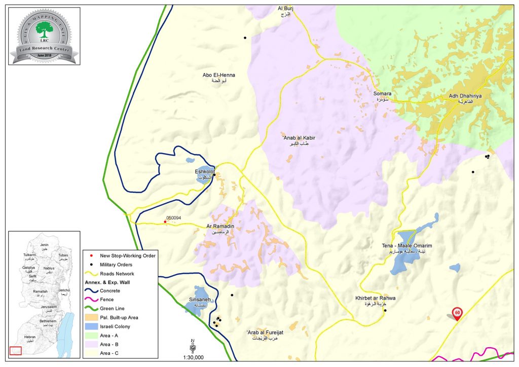 أخطرت سلطات الاحتلال الإسرائيلي، بتاريخ 5/6/2018م، بوقف العمل والبناء بحجة عدم الترخيص في منزلين بقرية الرماضين جنوب الخليل.