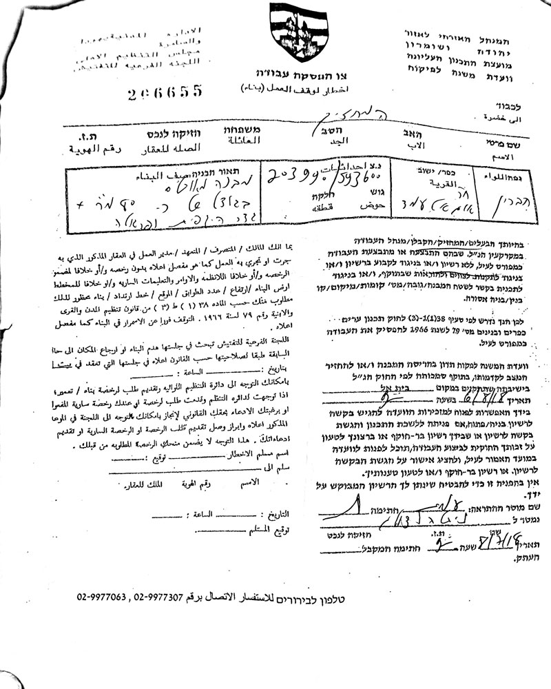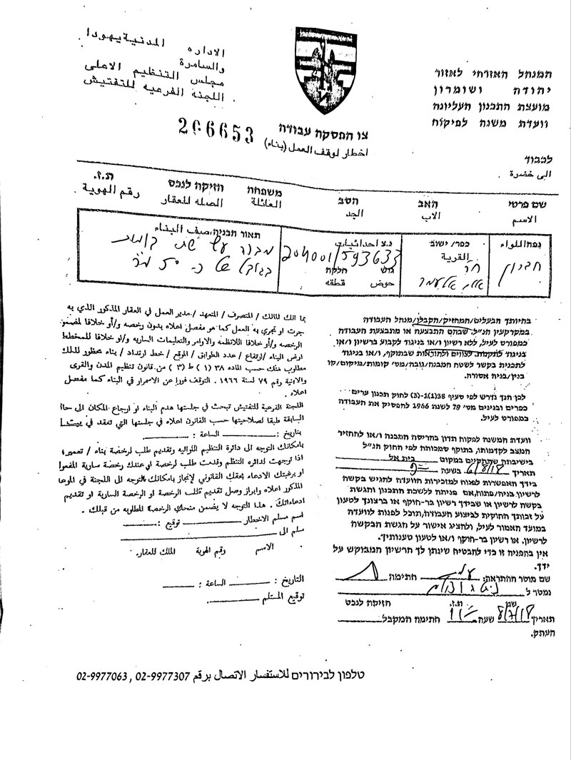 Notification No. (206655), which targets the first residence of the Abu Tbeekh family / Um al-Amad-Yatta