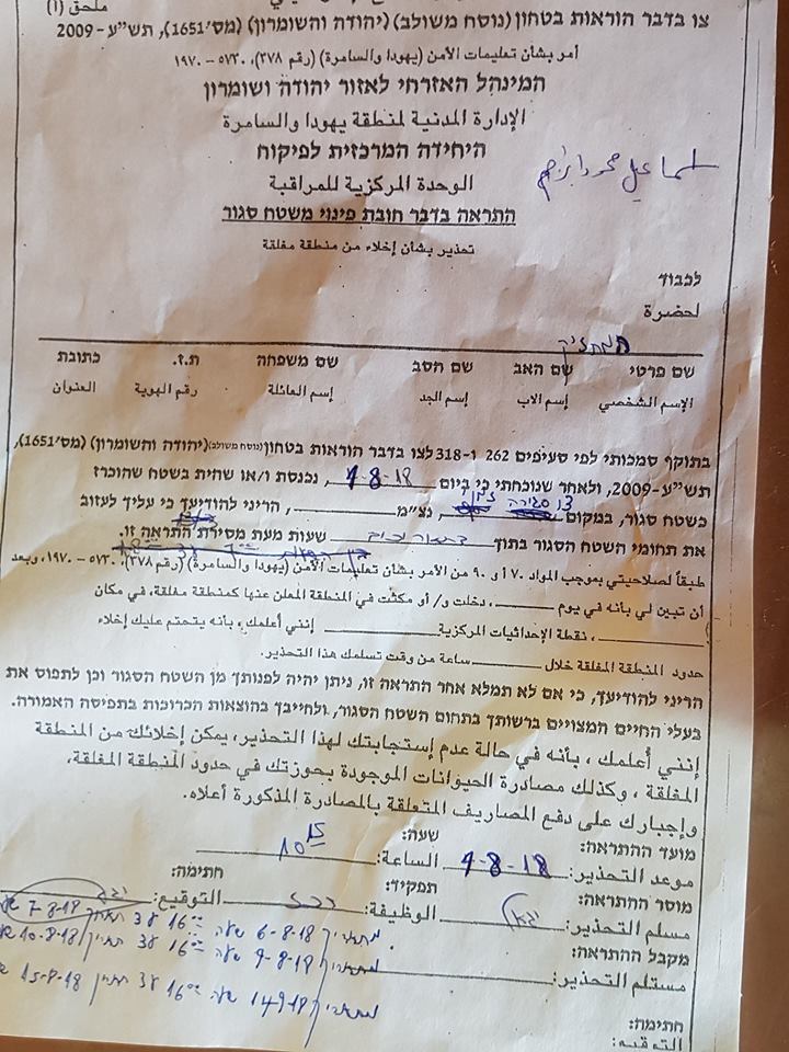 Israeli Occupation Forces on August 1, 2018 raided the area of Yarza Hamlet, in Tubas city and delivered some residents eviction military orders. This measure will negatively affect 4 Bedouin families.