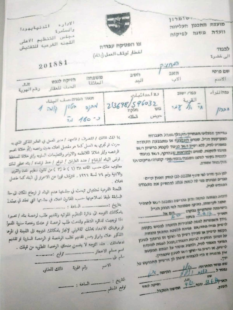 Picture 4: Stop-work order for citizen Mahmoud Abu Tah home.