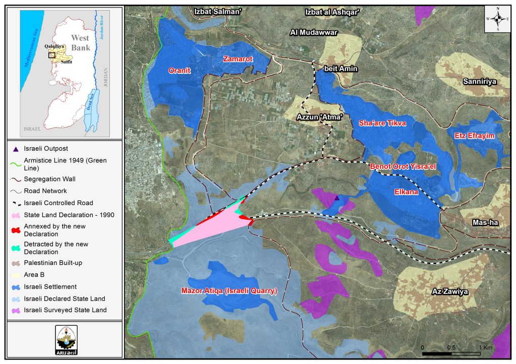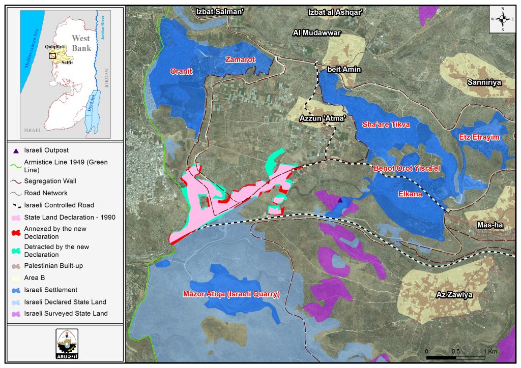 On the 17th of April 2016, the so-called “Custodian of Absentee Property and Israeli Land Authority of Judea and Samaria” issued two military orders declaring the expropriation of 1160 dunums of Palestinian lands in Salfit and Qalqilyia Governorates, as “State land”. The first order targeted Palestinian land in Az-Zawiya town, in Salfit Governorate, and was based on a previously issued expropriation order of 1990. See Map 2