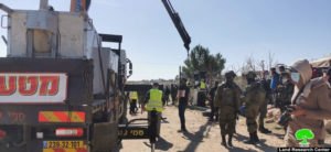 فقد هدمت سلطات الاحتلال الخيميتين البالغ مساحتها حوالي ( 60 م2) وصادرتها عبر تحميل الأقواس المعدنية على شاحنة مرافقة لهم، والشادر تم تحميله على مركبات تابعة للإدارة المدنية.