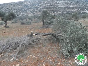 In the early evening hours of Thursday, 5/5/2022, a group of settlers from the settlement of “Brukhin” raided the olive fields in the “Al-Qasariah” area, located to the north of the town of Kafr ad-Dik, west of Salfit Governorate, and sawed down the stems and branches of 24 olive trees aged 25 years, causing total damage to 9 trees and partial damage to 15 others.