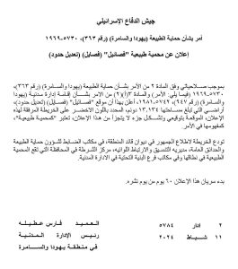 • جيش الدفاع الإسرائيلي (أمر بشأن حماية الطبيعة يهودا) والسامرة) (رقم (٣٦٣)، ٥٧٣٠-١٩٦٩) – إعلان عن محمية طبيعية “فصائيل” (فصايل) تعديل حدود): وينص الامر العسكري الإسرائيلي على ما يلي: “بموجب صلاحياتي وفق المادة ٢ من الأمر بشأن حماية الطبيعة يهودا والسامرة) (رقم (٣٦٣) ٥٧٣٠ – ١٩٦٩ فيما يلي: الأمر والمادة (۳ (۱) (۲) من الأمر بشأن إقامة إدارة مدنية (يهودا والسامرة) (رقم (٩٤٧) ، (۵٧٤٢ – ۱۹۸۱ ، أعلن بهذا أن موقع فصائيل” (فصايل) تعديل حدود) أراضي التي تبلغ مساحتها ۱۳,۱۳٤ دونم، المحدد باللون الاخضر على الخريطة المرفقة لهذه الإعلان الموقعة بتوقيعي وتشكل جزء لا يتجزأ من هذا الإعلان، تعتبر “كمحمية طبيعية”، كمفهومها في الأمر.”
