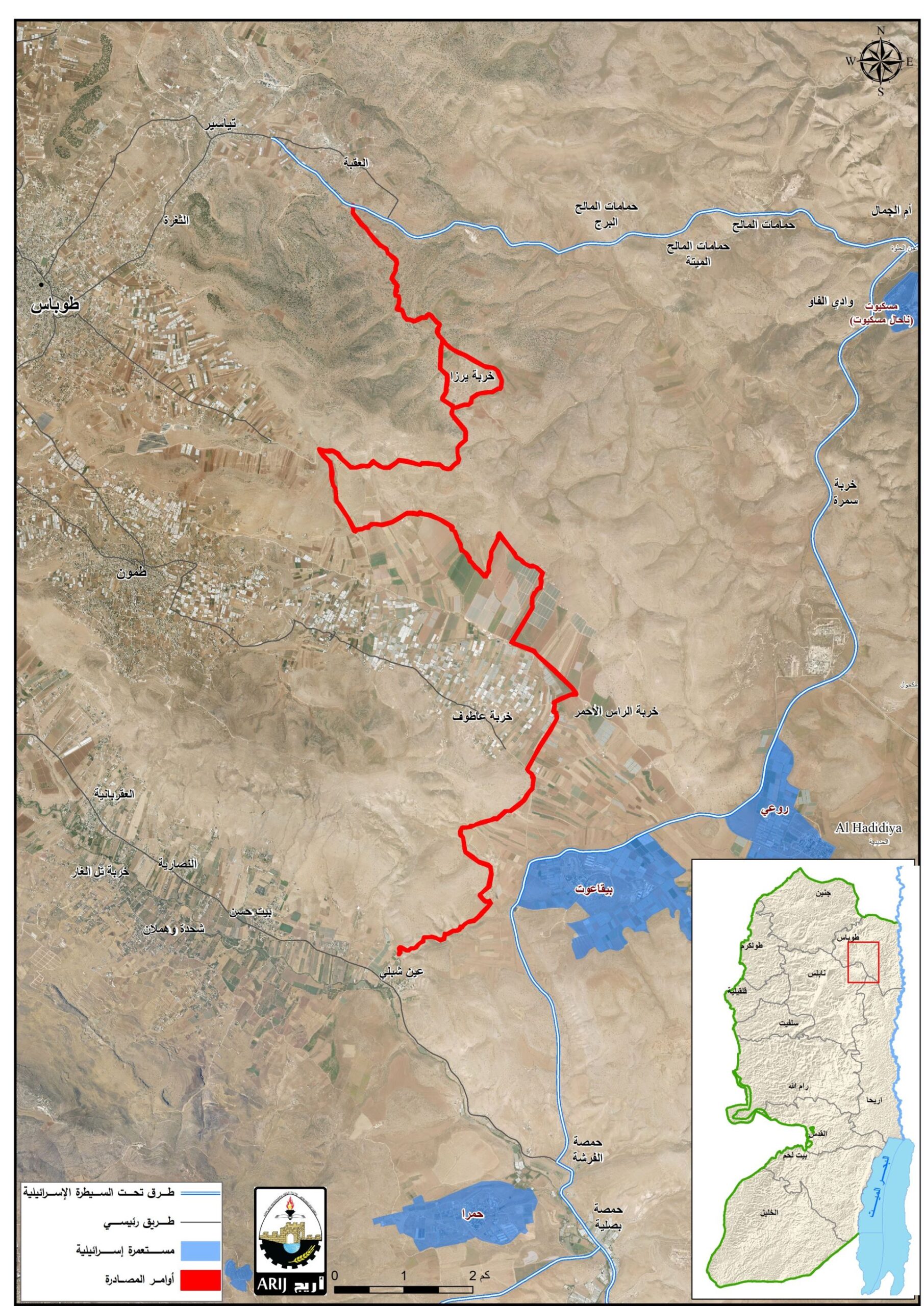 وتظهر الخرائط المرفقة للأوامر العسكرية الصادرة، بان سلطات الاحتلال تنوي شوق طريق التفافي جديد على أراضي محافظة طوباس، بدأ من جنوب قرية العقبة في محافظة طوباس, متفرعا من الطريق الالتفافي رقم 5799 باتجاه الجنوب, مرورا بأراضي خربة يرزا ليحيطها من جميع الجهات ومن ثم يكمل جنوب غرب, مرورا بأراضي بلدة طمون (من الناحية الشرقية للبلدة) ومن ثم يكمل باتجاه الجنوب, نحو خربتي عاطوف والرأس الأحمر وانتهاءا بتجمع عين شبلي في محافظة نابلس. وتجدر الإشارة الى أن مسار الطريق الالتفافي الجديد يبدو وكأنه طريق بديل لأهالي منطقة الاغوار, بهدف استبدال الطريق الالتفافي المعتاد (الطريق الالتفافي رقم 578) الذي يستخدمه المواطنون الفلسطينيون القاطنين في المنطقة والذي يمر بعددا من المستوطنات الإسرائيلية.