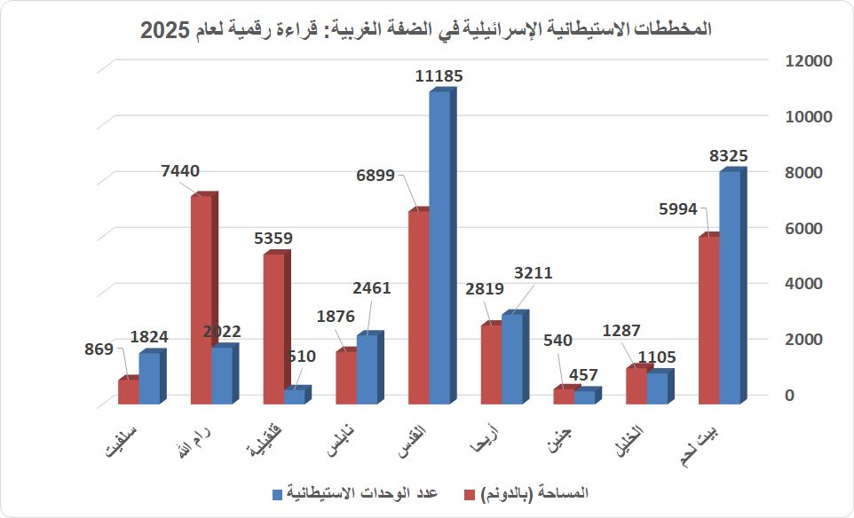 خلال العام 2025، شهدت الضفة الغربية المحتلة تصاعدًا كبيرا وغير مسبوق في وتيرة التوسع الاستيطاني الذي تجلّى في العددّ الكبير من المخططات الاستيطانية التي تم طرحها والإعلان عنها للبناء داخل المستوطنات الإسرائيلية. فقد سجل معهد الأبحاث التطبيقية – القدس (أريج) ما مجموعه 251 مخططًا استيطانيًا جرى طرحها خلال العام 2025، وتضمّنت مشاريع لبناء ما يزيد عن 31 ألف وحدة استيطانية جديدة في مختلف مستوطنات الضفة الغربية مع مصادرة أكثر من 33 ألف دونم من الأراضي الفلسطينية لأغراض متعددة مثل شق الطرق وانشاء مستوطنات صناعية وغيرها من مخططات المباني العامة والحدائق حيث تعكس هذه الأرقام السياسة الممنهجة التي تسعى من خلالها حكومة الاحتلال الاسرائيلي إلى فرض أمر ديموغرافي وجغرافي جديد على الأرض الفلسطينية.