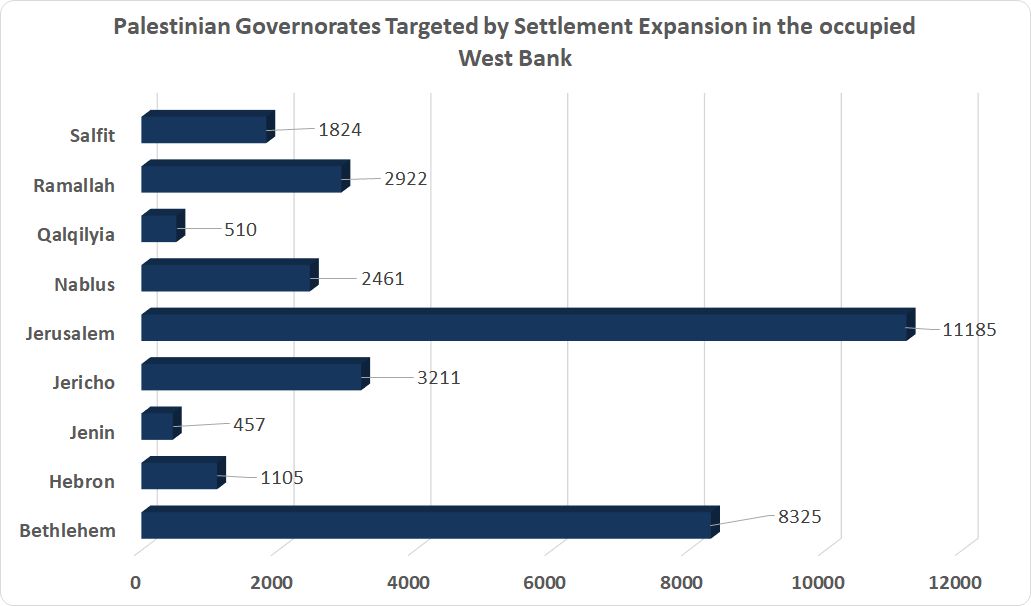 Several Palestinian governorates emerged as key targets of Israeli settlement plans, with the highest number of proposed units concentrated in strategically important areas—whether due to their geographic location, urban growth, or natural resources; most notably in the governorates of Jerusalem, Bethlehem, and Ramallah, respectively.