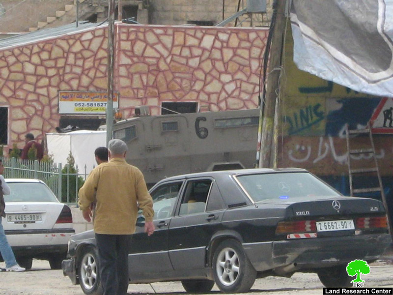 As it’s been the case always, Israeli occupation forces use the excuse of security in all of its hostile activities against the occupied Palestinians, be it house demolition, tree uprooting or apprehension. An Israeli military tower is present at the entrance of Beit Ummar. Israeli patrol jeeps do not leave the entrance (see picture attached herewith). Israeli soldiers stop and search cars at will and in accordance with the mood of the soldiers. That is in addition to raiding the houses located on the main road. A number of serious injuries by soldier gunfire have also been reported. The afore-mentioned notes indicate that the area in which the barrier is planned is totally under the control of the occupation soldiers to do in it what they wish. It is the belief of LRC that the establishment of the barrier in that area is only an initial step to suffocate the town of Beit Ummar for the benefit of the colonists passing by it on daily basis.