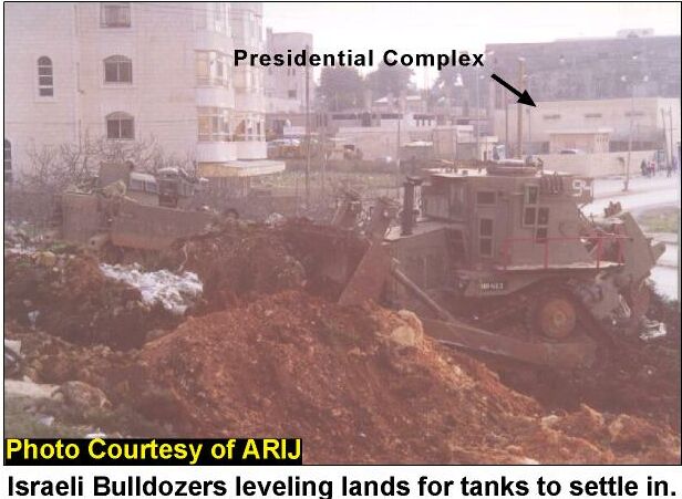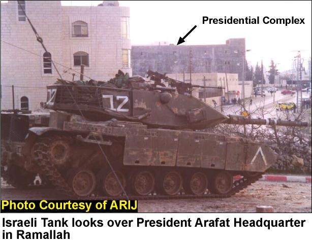 On January 18th 2002, Israeli tanks moved into Ramallah from three directions: North, East, and southeast. The most serious incursion; however, was the northern one since it directly threatened the presidential complex, See Satellite map.