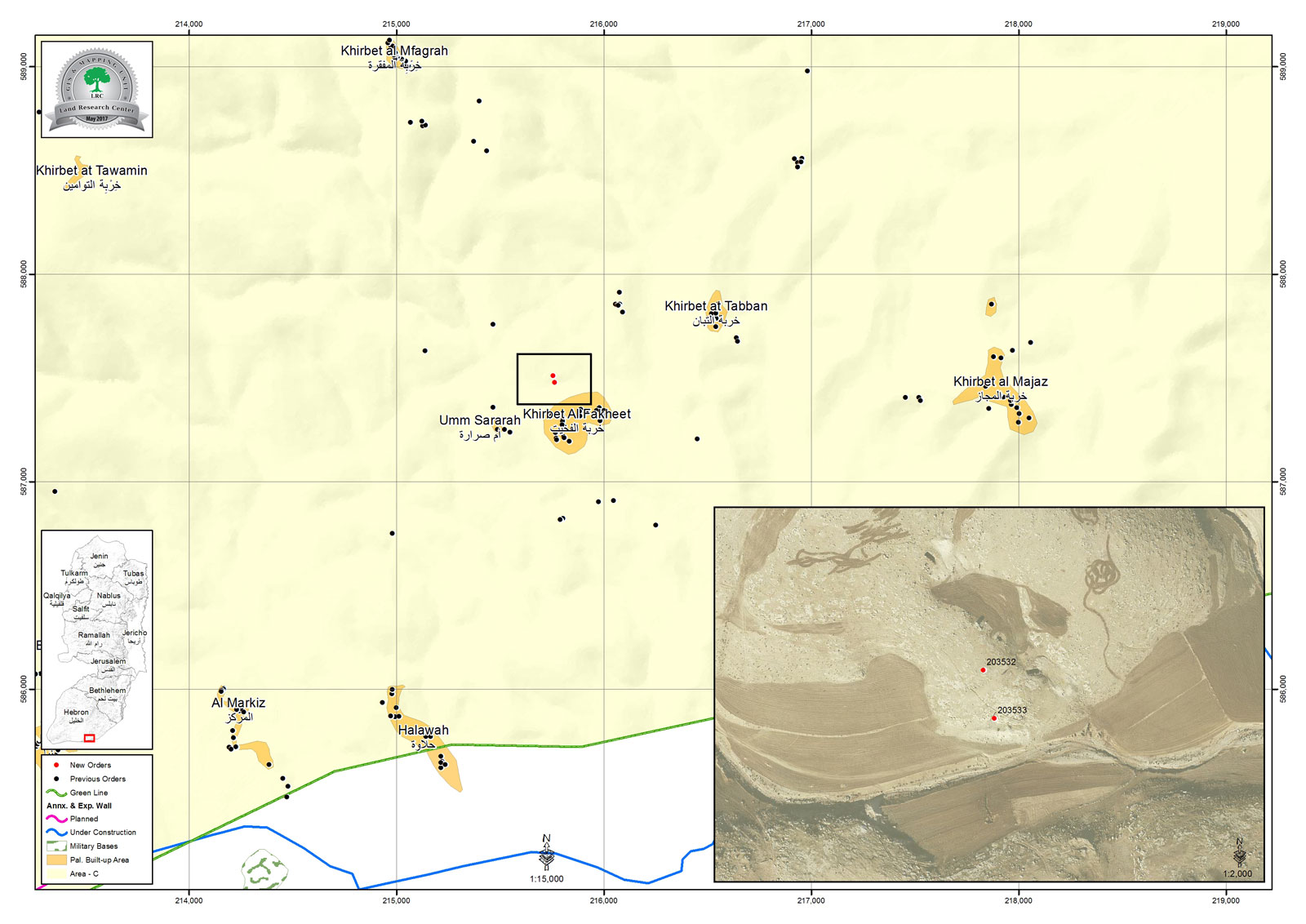 The order mentioned that the structures were unlicensed and built in area classified "C" according to Oslo Accords. Also, the notices ordered immediate halt on construction works and assigned May 18, 2017 as the hearing session of the Inspection Sub-Committee in the Israeli court of Beit El to consider the status of the notified structures.