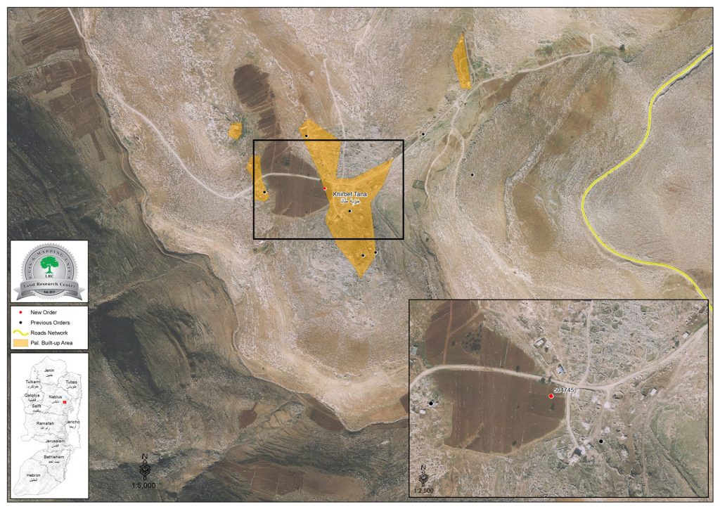 Khirbet Tana has a total land area of 6000 dunums that are all classified as  area "C" according to Oslo Accords. One third of Tana's lands was confiscated for the favor of Mekhora and Jetit colonies.
