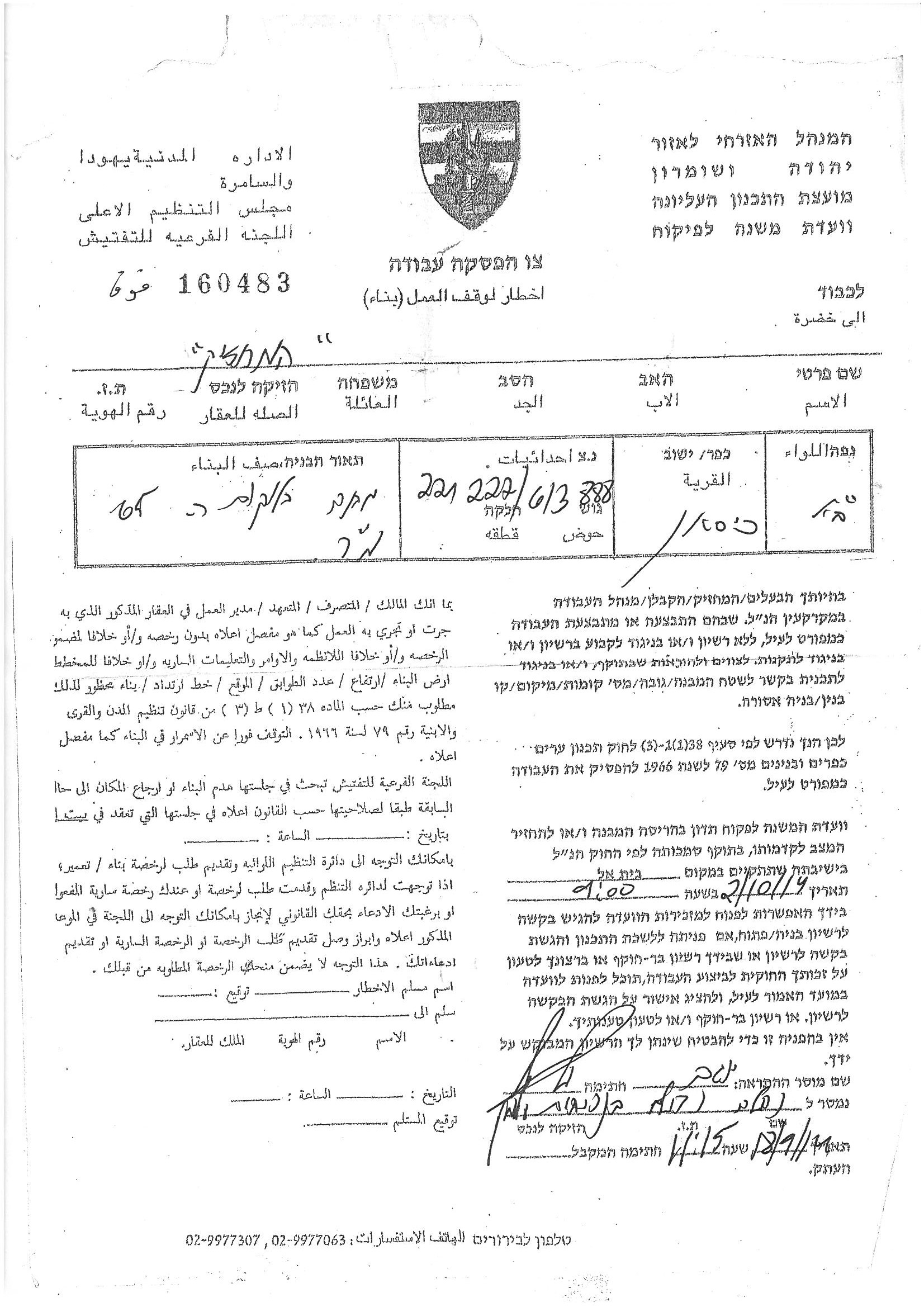 On September 18, 2014 the Israeli Occupation Army handed over local residents of Kisan village southeast of Bethlehem Governorate five military demolition orders for their houses under the pretext of lacking building permits due to their location in the area classified as "C" , according to OSLO II interim agreement of 1995. The first targeted house is owned by the local residents Nader ‘Ali Youseph ‘Ebayyat ( 7 family members) and was built in the year 2012 ,occupying an area of 80 m2 . The military order holding number 160482. See photocopy of the demolition order and pictures of the house below: