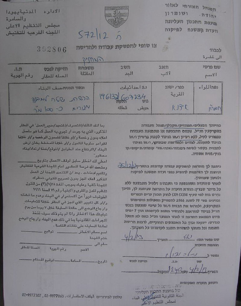 On February 4, 2013, the Israeli Occupation Civil Administration served two families in Idhna stop-work and demolition orders for under construction residences.