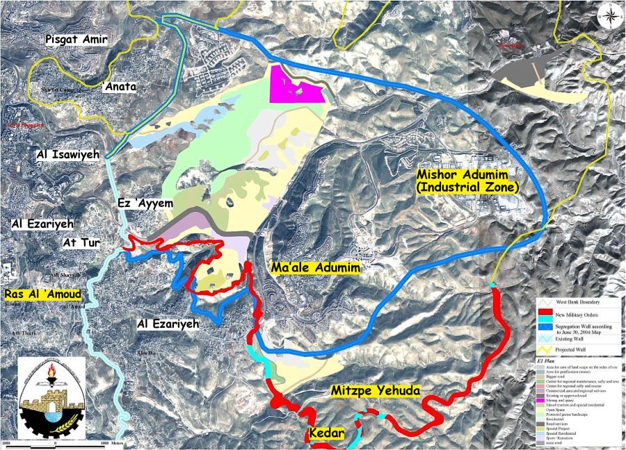 With Israel's decision to construct the Segregation wall in the West Bank, the Ma'ale Adumim bloc has gained the attention of the Israeli Government due to its location inside the Jerusalem Governorate boundaries and its closeness to the eastern part of Jerusalem city. A new addition to the Ma'ale Adumim settlement block has started to take place in the confiscated Palestinian lands between east Jerusalem and Ma'ale Adumim settlement, the expansion is called the E1 plan and aims at hampering East Jerusalem Palestinian localities from expanding the built-up areas of their towns and villages, at the same time, ensuring a Jewish majority in the area through the addition of 3500 new housing units to the northwest of the Settlement, and creating a corporal link between the bloc itself and Israeli settlements in Jerusalem (the French Hill, Pisgat Amir, Pisgat Ze'ev and Neve Yaacov). The 'E1', once fully implemented, will increase the area of the settlement by more than 50% and will block the geographical contiguity between the northern and southern parts of the West Bank.